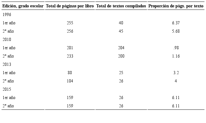 Los datos de la Tabla 4 sugieren a simple vista que los libros de 2010 resultan ser volúmenes más copiosos que el resto. La cantidad de textos incluidos en cada libro de lectura es importante en el contexto de uso a lo largo del ciclo escolar. Si consideramos que la planeación de un año escolar tiene cinco bimestres de trabajo, los libros editados en 1996 proporcionaron ocho lecturas por bimestre a los niños de primero de primaria y 11.25 a los de segundo. A diferencia de estos, los editados en 2010 incluyeron alrededor de 40 lecturas por bimestre (entre 8 y 10 textos por semana), para los dos primeros grados de primaria. Desafortunadamente, el número de textos a disposición de los aumnos por bimestre decreció considerablemente en las ediciones de 2013 y 2015 incluyendo, en promedio, solo cinco textos por bimestre. Es decir, que con estos materiales apenas y se podría leer uno por semana.