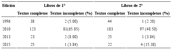 Para el presente estudio evaluamos ocho libros de lectura, cuatro correspondientes al primer año de primaria y el resto para segundo (ediciones de 1996, 2010, 2013 y 2015) con un total de 592 textos o lecturas.