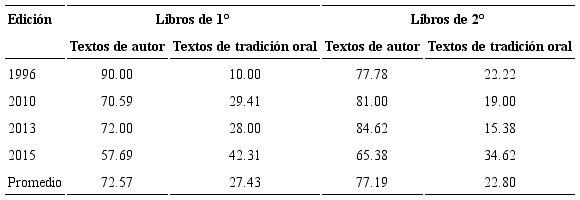 Al revisar los diferentes libros de lectura encontramos que si bien la mayoría de los textos compilados son de autor, existe una tendencia a incrementar los de tradición popular hacia las ediciones más recientes (Tabla 7).