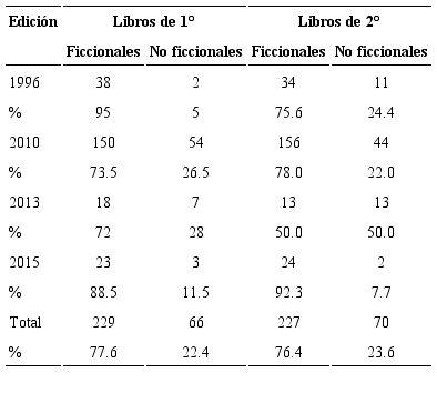 Los libros de lectura para segundo año, desde la edición de 1996 habían incluido al menos 22% de textos no ficcionales. Lamentablemente, en su última edición (2015) solamente se incluyeron dos de este tipo (7.7%).