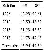 Los libros para primer año tienen menor presencia de textos de autor que los de segundo. Asimismo, la tendencia a disminuir estos textos en las ediciones más recientes se presenta sobre todo en los libros de primero. Es relevante señalar que los libros de 1996 para primero de primaria presentaron el porcentaje más alto de textos de autor de todos los analizados, mientras que los de 2015, las proporciones más bajas, para ambos grados de primaria.