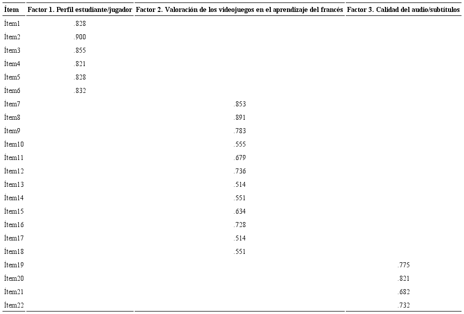 El cuestionario utilizado para llevar a cabo este estudio, denominado, como mencionamos anteriormente, “Cuestionario sobre el uso de videojuegos en la enseñanza del francés en educación superior”, está compuesto por 22 ítems. La validación y fiabilidad del instrumento han sido medidas y corroboradas mediante diferentes análisis estadísticos. En cuanto a la validez de constructo, hemos realizado un análisis factorial exploratorio (Tabla 1), utilizando para la ejecución de esta prueba el método de la correlación de Pearson (Lorenzo-Seva y Van Ginkel, 2016), ya que la varianza presenta una distribución normal, medida a través de la prueba de Kolmogorov-Smirnov (p=0.200), junto con un proceso de extracción de factores comunes “máxima verosimilitud”, considerando un procedimiento de rotación “Varimax”, cuyo índice Kaiser-Meyer-Olkin (KMO) es de 0.80 y test de esfericidad de Bartlett con p=0.000. El resultado de la extracción refleja la existencia de tres factores, donde la varianza total explicada es de 68%, lo cual revela un equilibrio apropiado entre los componentes del instrumento, representativos del concepto teórico. La medición de la fiabilidad se ha llevado a cabo a través del enfoque de consistencia interna (Merino-Soto, 2016), obteniendo un Alfa de Cronbach de 0.89, lo cual refleja una fiabilidad alta de los ítems expresados en el cuestionario, siendo esta para cada uno de los factores de: 1. Perfil del estudiante/jugador (α= .92); 2. Valoración del videojuego para el aprendizaje del francés (α= .91); y 3. Calidad del audio y subtítulos del videojuego (α= .80).
