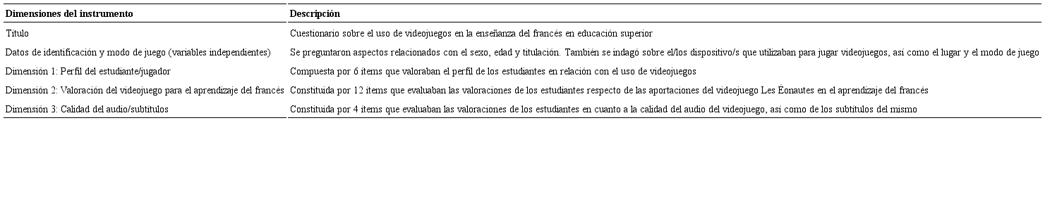 A través de los 22 ítems medidos en escala Likert de 5 puntos (de 1 = totalmente desacuerdo, a 5 = totalmente de acuerdo), se preguntó a los estudiantes para conocer su opinión acerca del uso del videojuego Les Éonautes en el aprendizaje del francés, como segunda lengua. Además, se les solicitó que respondiesen a una serie de preguntas directas que hacían alusión a sus datos personales (sexo y edad), académicos (titulación), así como de relación con los dispositivos utilizados para el uso de videojuegos, lugar y modo de juego.