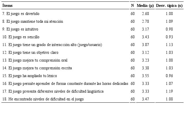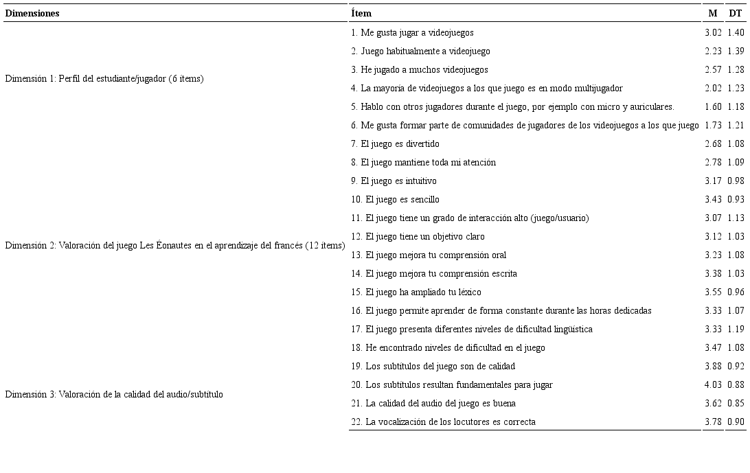 Esta dimensión está compuesta por 12 ítems en los que se valora la utilización del videojuego. Concretamente las características del juego (entorno, nivel de dificultad, grado de interacción, etcétera) y el aprendizaje del francés (comprensión oral y escrita, enriquecimiento léxico, nivel de dificultad, etcétera) (Tabla 5).
