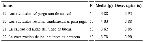 Esta dimensión está compuesta por cuatro ítems con los que se valora la calidad del audio y subtítulos del videojuego (Tabla 6).