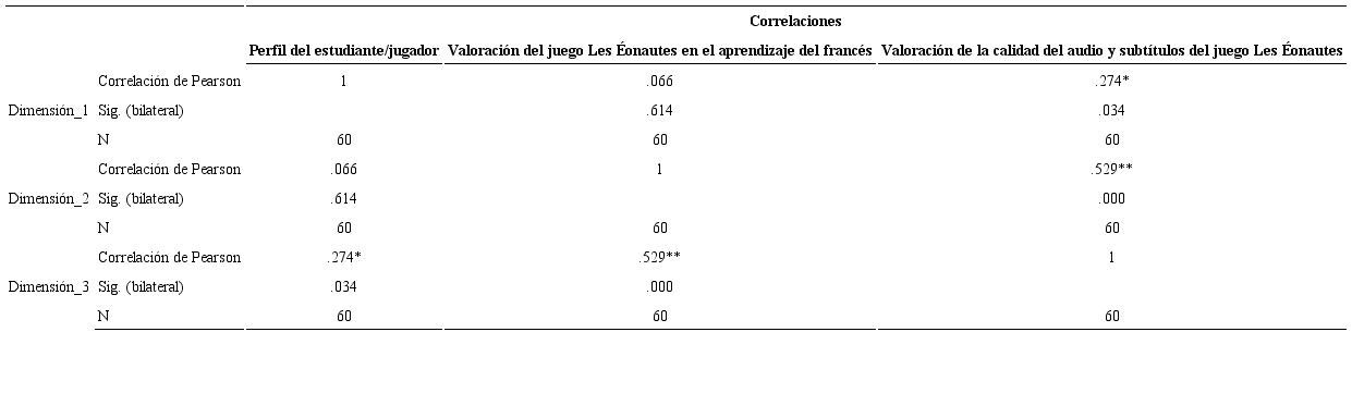 Por otra parte, podemos afirmar que existe relación entre la dimensión 2 (valoración del videojuego Les Éonautes en el aprendizaje del francés) con la 3 (valoración de la calidad del audio y los subtítulos del videojuego Les Éonautes en el aprendizaje del francés) (r=.529 y p=.000), dado que hay nivel de significatividad bilateral al n.s=0.01. La relación entre las mismas es moderada, como señalan los autores mencionados anteriormente.