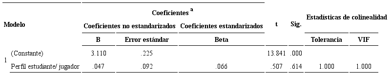 Los resultados obtenidos que se reflejan en la Tabla 8, nos permiten observar que la dimensión perfil estudiante/jugador no constituye un factor predictor de la dimensión Valoración del videojuego Les Éonautes en el aprendizaje del francés, ya que β=.066, t(066)=0.507, p>.001 y, por tanto, no es estadísticamente significativa, por lo que no aceptamos la hipótesis de relación lineal entre el perfil del estudiante/jugador y la valoración del videojuego Les Éonautes en el aprendizaje del francés. En este sentido, el valor de R2 es de -.013.