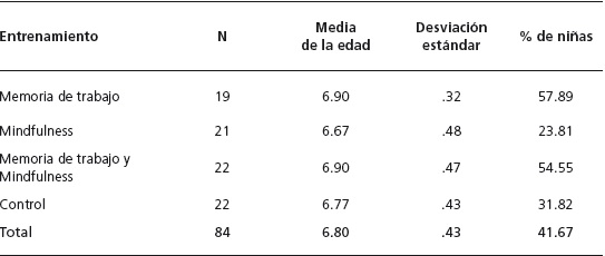 Los niños fueron asignados aleatoriamente a uno de tres grupos experimentales y uno de control. La edad media fue de 6.80 años, 35 fueron mujeres y 49 hombres. Los grupos no difirieron en edad, F (3.80) = 1.16, p = .33, ni en sexo, χ2 (3) = 4.48, p = .21. Los detalles de la muestra se exponen en la Tabla 1.