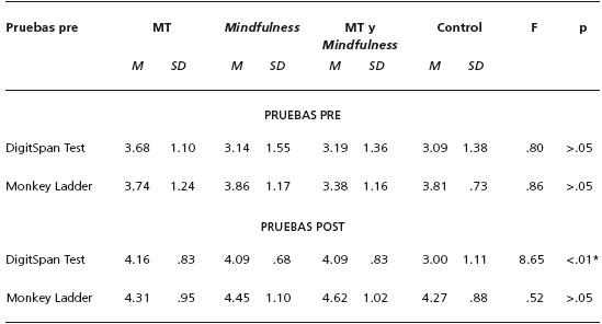 En la Tabla 2 se presentan los resultados obtenidos para las pruebas pre y post-intervención de la MT. Se observaron diferencias significativas entre los grupos experimentales y el control para los puntajes de la prueba post del Digit Span Test, F (3, 2.72)= 8.65, p<.01. Igualmente, por medio de la prueba ANOVA, con medidas repetidas, se evaluó el efecto del entrenamiento en los distintos tratamientos.