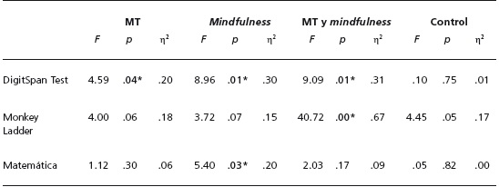 A diferencia del grupo control, los tres experimentales mostraron un cambio significativo en las pruebas de memoria (ver Tabla 3). El grupo que recibió el entrenamiento combinado fue el único que obtuvo una mejora significativa tanto en la interacción tiempo×tratamiento en el Digit Span Test, F (1, 4.35)= 9.09, p= .01, η2=.31, como en el Monkey Ladder, F (1, 4.35)= 40.72, p= .00, η2= .67. Por su parte, los tratamientos de entrenamiento de solo MT y de solo mindfulness mostraron un efecto significativo en la prueba Digit Span Test, F (1, 4.41)= 4.59, p= .04, η2= .20, y F (1, 4.32)= 8.96, p= .01, η2= .30, respectivamente.
