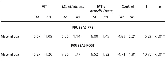 Los resultados para cada tratamiento de las pruebas de desempeño matemático, pre y post intervención, se condensan en la Tabla 4. Se encontraron diferencias significativas en los resultados de la prueba empleada para evaluar el desempeño matemático entre los grupos experimentales y el control tanto en las pruebas pre y post-intervención, F (3, 2.72)= 6.28, p< .01, y F (3, 2.72)=10.73, p< .01, respectivamente. De igual forma, se evaluó el efecto del entrenamiento a través de la diferencia entre la media de los grupos, con medidas repetidas, cuya significatividad se establece con la prueba ANOVA. En este caso, solo se observó una interacción significativa tiempo×tratamiento en el grupo que recibió el entrenamiento de mindfulness (ver Tabla 3), F (1, 4.32)= 5.40, p= .03, η2= .20. No hubo efectos significativos en la prueba matemática para los otros grupos experimentales y para el grupo control.