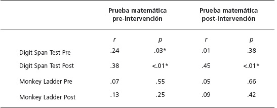 Por último, se exploró la relación entre la memoria de trabajo y el desempeño matemático a través del análisis de correlación lineal; los resultados se muestran en la Tabla 5. Como se puede observar, se encontraron correlaciones positivas tanto en la pre como en la post-intervención entre las pruebas matemáticas y el Digit Span Test. Se observó que los niños con puntajes altos en este último eran más propensos a obtener mayores puntajes en las pruebas matemáticas; sin embargo, esta relación no se observó para la prueba Monkey Ladder.