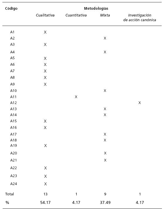 En lo referente a la metodología utilizada, 13 de los artículos estudiados han utilizado métodos cualitativos, nueve han aplicado métodos mixtos, se ha detectado un trabajo bajo un método cuantitativo y otro utiliza la investigación-acción canónica (tabla 2).
