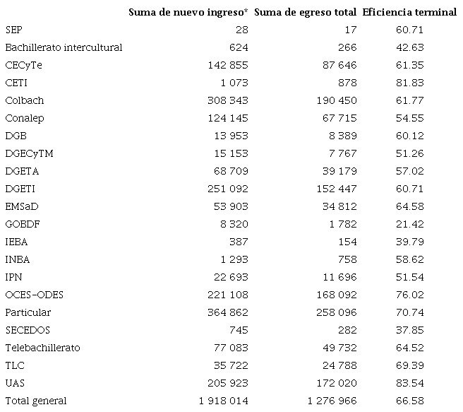 El abandono a lo largo del trayecto reduce la eficiencia terminal en el tiempo reglamentario a 67.4% a nivel nacional, dato que también varía por entidad y por subsistema. Los bachilleratos universitarios (propedéuticos) y los CETIs (bivalentes) presentan una tasa muy superior de eficiencia terminal: 83.5 y 81.8%, respectivamente; por el contrario, la DGETA, el Conalep, y la Dirección General de Educación en Ciencia y Tecnología del Mar (DGECyTM) presentan una eficiencia terminal inferior al promedio: 57.02, 54.5 y 51.2%, respectivamente (Tabla 4).