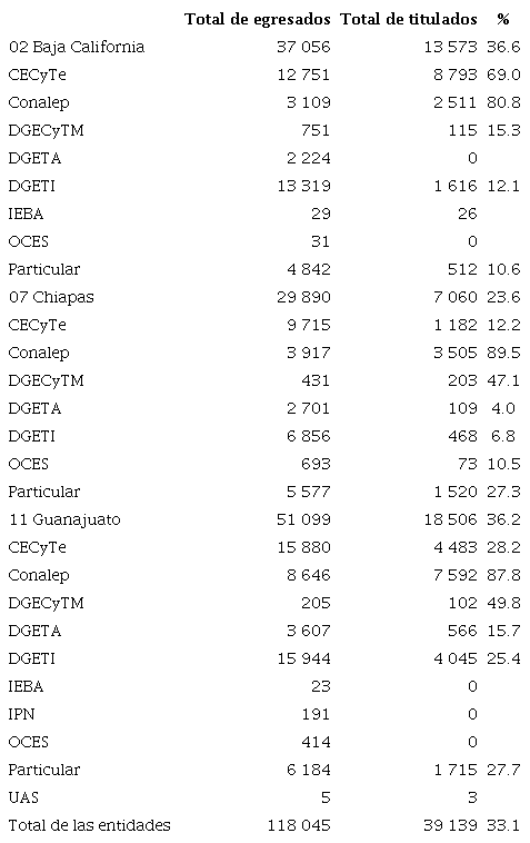 Existen lagunas importantes de información sobre la modalidad educativa que nos ocupa, en particular la que documente si la formación para el trabajo en el nivel medio del sistema escolar ha sido eficiente y pertinente, o en qué grado se puede calificar. Como antecedente habrá que considerar los muy serios problemas de abandono anual de los alumnos con un promedio de 13.6% del total, en particular en los primeros semestres y que entre las modalidades tecnológicas alcanza una tasa mayor y con diferencias entre entidades. La DGETI reporta una tasa promedio de abandono de 16.3%, pero en Chiapas es de 27% y en Sinaloa de 7%; el Conalep registra 19% de abandono promedio, pero en Baja California es superior, 22%, y en Chiapas inferior, 12.7 por ciento.