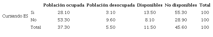 Con la finalidad de reconocer la complejidad de situaciones que se pueden dar en esta población, presentamos un análisis comparado entre dos variables sobre la situación de los jóvenes después del egreso. Por un lado, la continuación de estudios y, por otro, la caracterización de los jóvenes en términos de su condición como población económicamente activa (PEA) o como no económicamente activa (PNEA). La PEA se divide en dos situaciones: ocupación y desocupación (desempleo abierto, personas que no trabajan pero buscan activamente hacerlo), mientras que la PNEA se divide en “disponibles”, las personas que no trabajan ni buscan activamente trabajar, pero estarían dispuestas a hacerlo si tuvieran una oferta, y “no disponibles”, que refiere a las personas que no trabajan, no lo buscan activamente ni tampoco lo harían aunque tuvieran una oferta de trabajo.