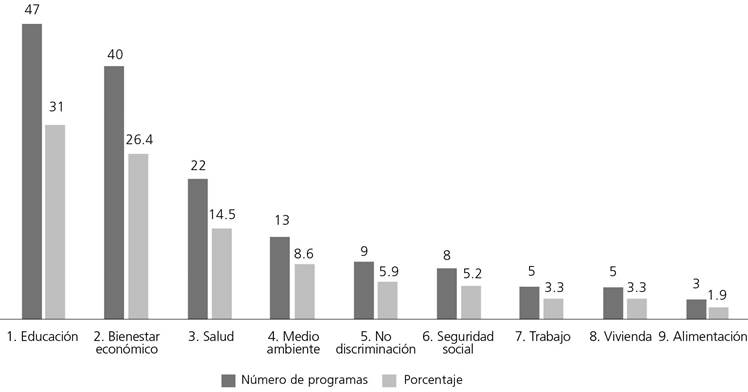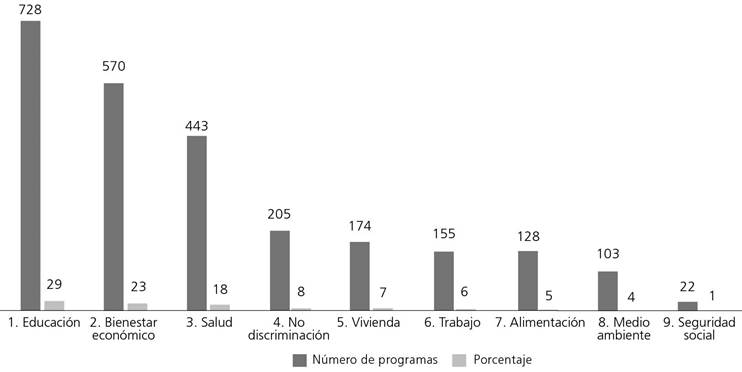 De acuerdo con información del Coneval, entre 2017 y 2018 coexistían 1505 programas federales que atendían diferentes ámbitos de los derechos sociales (educación, bienestar económico, salud, medio ambiente, no discriminación, seguridad social, trabajo, vivienda y alimentación); cinco de ellos se concentraban en el empleo/trabajo, dos operados por las Secretaría de Economía6 y tres por la STPS.7 Los programas dirigidos al ámbito del trabajo ocupan el séptimo lugar de nueve rubros, lo que representa 3.3% del total de programas federales, en contraste con 31% para educación (Figura 1). El tipo de apoyos consiste, principalmente, en servicios de bolsa de trabajo, prácticas laborales, talleres ocupacionales y ferias de empleo.