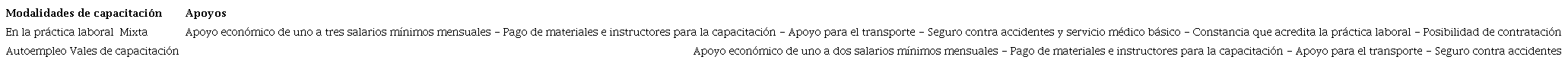 Los apoyos que se ofrecen consisten, principalmente, en cursos de capacitación en oficios específicos, ferias de empleo, servicios de bolsa de trabajo, talleres ocupacionales, capacitación, asesoría y orientación, financiamiento para el desarrollo, mejora o consolidación de actividades o proyectos productivos, vinculación con empresas y en muy pocos casos, en prácticas laborales y beca económica durante la estancia en una empresa.