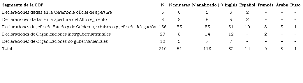 Se incluyeron un total de 116 discursos publicados en la página oficial de la Convención Marco de las Naciones Unidas sobre el Cambio Climático (CMNNCC o UNFCCC, por sus siglas en inglés), los cuales corresponden a representantes de las diversas Partes presentes, de las organizaciones no gubernamentales e intergubernamentales que participaron del alto segmento, como también del equipo que presidió la Conferencia y de las autoridades de aquellas naciones que fueron fundamentales en la realización de la COP25 (Chile y España).1 Se realizó un muestreo intencional (Pérez-Luco, Lagos, Mardones y Sáez, 2017), pues en esta muestra se concentran los tomadores de decisiones en torno al cambio climático. La Tabla 1 muestra la distribución de estos discursos según número de actores/actrices e idiomas.