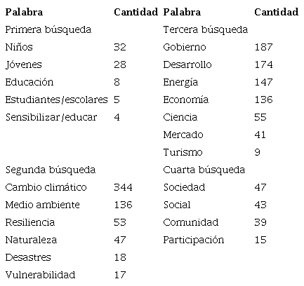 Tal como visibiliza el conteo, en ocho ocasiones se menciona la palabra educación, es dos veces utilizada para designar el cargo del Ministro de Educación, Innovación, Relaciones de Género y Desarrollo sostenible de Santa Lucía. Aparecen cinco veces las palabras estudiantes o escolares, lo que contrasta con las 32 que se menciona a los niños o las 28 que se nombró a los jóvenes. Otras de las tendencias que podemos observar en la Tabla 2 es la alta presencia de palabras como cambio climático, medio ambiente y otras asociadas a los medios considerados naturales, sus actuales transformaciones, daños y las problemáticas socioambientales que se desprenden de estas.