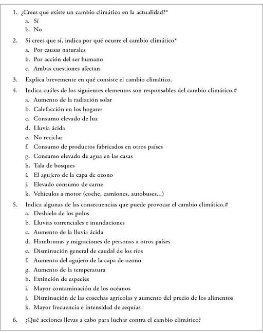Se elaboró un formulario de seis preguntas abiertas y cerradas (Figura 1) basado en otras encuestas utilizadas en la bibliografía (Boyes y Stanisstreet, 1993; Francis et al., 1993; Liarakou, Athanasiadis y Gavrilakis, 2011; Jafer, 2019). La encuesta incluyó preguntas sobre la existencia de cambio climático (pregunta 1), el propio concepto de dicho fenómeno (pregunta 3), las causas que lo generan (preguntas 2 y 4), sus consecuencias (pregunta 5) y las acciones del alumnado para combatir este problema ambiental (pregunta 6) (Figura 1).