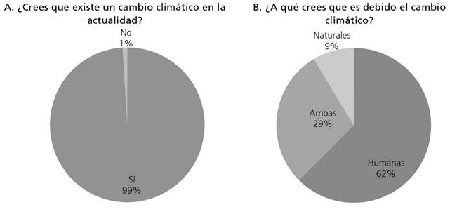Como puede observarse en la Figura 2, prácticamente la totalidad del alumnado (99.04%) cree que existe un cambio climático actualmente (Figura 2A) Asimismo, la gran mayoría (91.15%) reconoce al ser humano como responsable de este fenómeno; el 28.85% considera que se debe a causas humanas y naturales, mientras que el 62.50%, que el ser humano es el único responsable (Figura 2B).