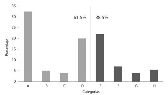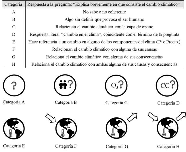 A partir de las respuestas dadas a la pregunta 3 del formulario, se establecieron ocho categorías de respuesta, que pueden consultarse en la Figura 3. Como puede leerse en la tabla superior de dicha figura, las categorías A-C son respuestas incorrectas desde un punto de vista conceptual, mientras que la D recoge aquellas que no proporcionan información adicional al término de “cambio climático”, sino que simplemente reproducen la misma locución escrita en la pregunta. Las categorías E-H introducen adecuadamente nuevos términos y conceptos relacionados con el cambio climático, sus causas y consecuencias (Figura 3).