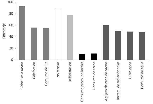 Unidas a estas ideas alternativas y de acuerdo con lo observado en otros estudios realizados en España en educación secundaria (Punter, Ochando y García, 2011), el alumnado presta más atención a causas como el uso de vehículos a motor o la deforestación, que a otras sobre las cuales tiene más capacidad de intervención, como el uso excesivo de luz o calefacción, o los modelos de consumo. Cabe destacar este último elemento, porque menos del 15% considera que el consumo de productos no locales o el excesivo de carne contribuyen al cambio climático, a pesar de su gran impacto en la emisión de GEI. El impacto de la comercialización de productos entre áreas geográficas remotas es evidente, relacionado con el uso excesivo de combustibles fósiles, mientras que numerosos estudios advierten sobre los impactos ambientales del consumo excesivo de carne en nuestras dietas (Ritchie, Reay y Higgins, 2018; Springmann, Clark, Mason-D’Croz, Wiebe et al., 2018). Tilman y Clark (2014) concluyen que si se mantienen las tendencias actuales en el aumento del consumo de carne, las emisiones de GEI de la dieta por persona serían un 32% más altas en 2050, lo que demuestra la necesidad de buscar alternativas. Sin embargo, la investigación sobre la dieta en los programas educativos no considera su sostenibilidad como otro elemento a tener en cuenta e inculcar al alumnado (Behrens, Kiefte, Bosker, Rodrigues et al., 2017).