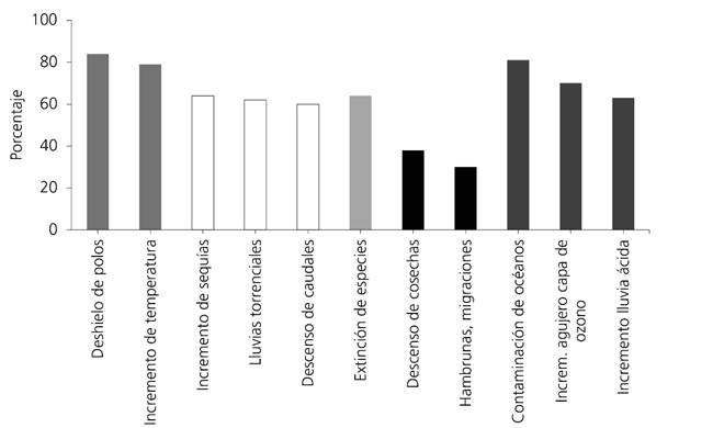 Se puede observar que las consecuencias que se identificaron en mayor medida fueron las relacionadas con un aumento de la temperatura y el consiguiente deshielo de los polos, con valores en torno al 80%. Las consecuencias relacionadas con el ciclo del agua (aumento de la sequía, inundaciones y disminución del caudal de los ríos) se identificaron en menor medida, con valores en torno del 60% de las respuestas, así como los efectos directos sobre la biodiversidad (Figura 6). Las consecuencias de carácter social (disminución de los cultivos y aumento del precio de los alimentos, y hambrunas y migraciones) fueron identificadas por un porcentaje aún menor de estudiantes, el 38 y 30%, respectivamente (Figura 6). Estas se seleccionaron incluso en menor medida que los problemas ambientales que no pueden considerarse consecuencia directa del CC, como el incremento de la degradación de la capa de ozono y la lluvia ácida, que fueron marcadas por más del 59% de estudiantes, o la contaminación de los océanos, que alcanzó el 80% de las respuestas (Figura 6).