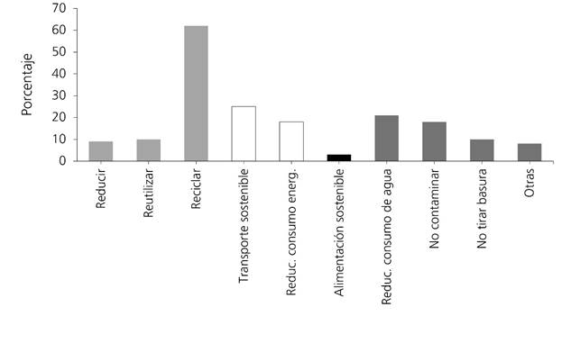 Entre todas las opciones, el reciclaje destaca muy por encima del resto, de modo que más del 60% del alumnado indica que recicla como una medida para reducir el cambio climático (Figura 7). Esta acción se lleva a cabo en un porcentaje mucho más alto que las otras incluidas en la regla de las 3R -reducir, reutilizar y reciclar-, que fueron identificadas por menos del 10% del alumnado (Figura 7). Entre el resto de las acciones, las relacionadas con una forma de transporte sostenible, como el uso del transporte público o la bicicleta, fueron elegidas por el 25% y diferentes formas de reducción en el consumo de energía, como la disminución del uso de calefacción o luz, por el 16.3%. Solamente una respuesta se refirió a una forma más sostenible de consumo de alimentos, reduciendo el de carne y de productos con excesivo envoltorio de plásticos. Por otro lado, entre las acciones que no podemos considerar correctas, el 21, 18 y 11% de estudiantes mencionaron la reducción del consumo de agua, no contaminar (sin especificar el tipo de contaminación) o no tirar basura, respectivamente (Figura 7). Finalmente, el 7.7% citó las acciones categorizadas como “otras”, descritas previamente (Figura 7).