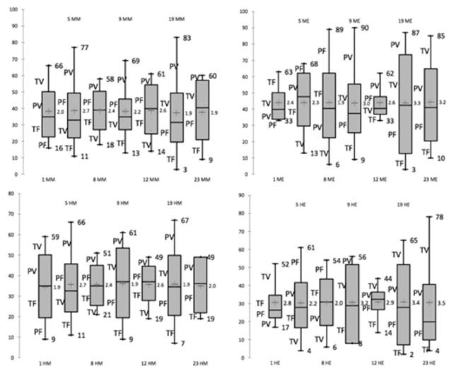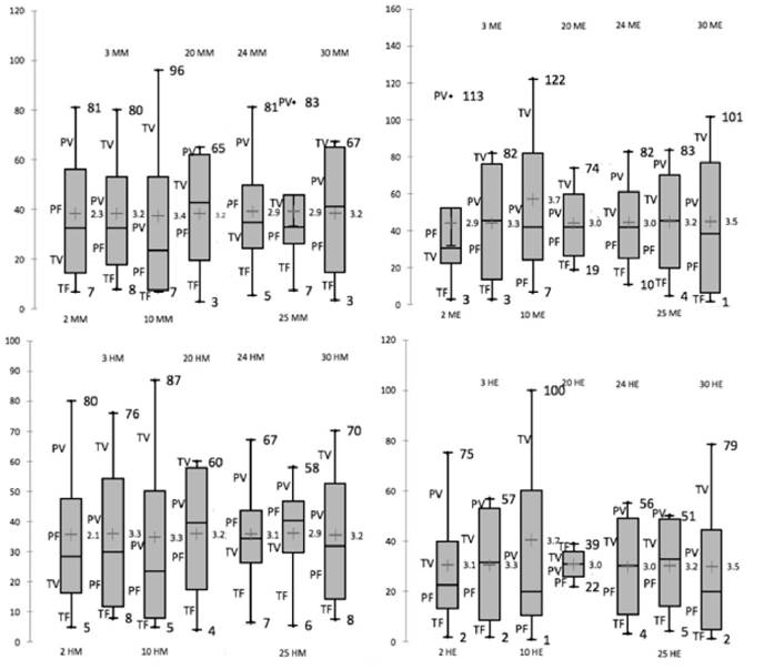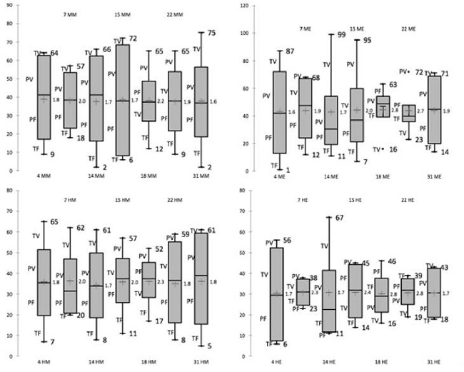 El estudio de las respuestas lo esquematizamos a través de gráficos de caja y bigote. La media de cada ítem se indica con el símbolo “+” junto con el valor de la media correspondiente en función de una escala de 1 a 4 que se corresponde con las opciones de respuestas: 4, la correcta; 1, la incorrecta; y 2 y 3, las respuestas intermedias.