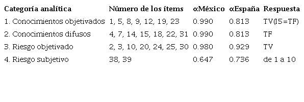 En el caso mexicano, las mujeres obtuvieron mayor frecuencia de respuesta correcta en todos los ítems de la categoría analítica 1 relacionada con conocimientos objetivados (ver Tabla 3), así como una mayor puntuación media exceptuando un ítem. Sin embargo, en la categoría analítica 2, relacionada con conocimientos difusos, ellas obtuvieron mayor porcentaje de acierto solamente en dos de los siete ítems. A pesar de ello, las medias obtenidas en ambos sexos son muy bajas en todos los ítems, lo que indica una fuerte presencia de conocimientos difusos en todo el grupo. En relación con la categoría analítica 3 sobre la representación del riesgo objetivado, las mujeres obtuvieron mayor frecuencia de acierto en dos de los siete ítems, aunque las medias obtenidas son muy similares, con mínimas diferencias de ±0.2 sobre 4. De este modo, el conocimiento declarado por el grupo mexicano es muy similar entre hombres y mujeres, salvo en lo que respecta a la información general sobre ciertos procesos atmosféricos, donde encontramos las mayores diferencias con significación estadística a favor de las mujeres. Así, estos resultados no permiten confirmar la hipótesis H1.