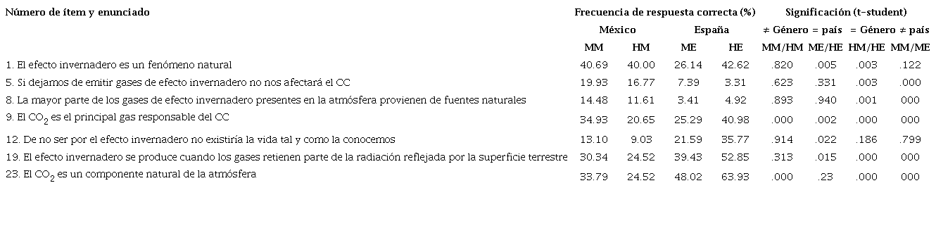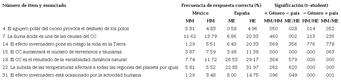 El estudio comparativo entre mujeres y hombres de México ofrece una relativa homogeneidad en esta categoría. Únicamente se obtuvieron diferencias significativas en contenidos relacionados con la influencia del CO2 en el CC (ítem 9) y su origen natural (ítem 23). En el caso español, por el contrario, los hombres obtuvieron mayores frecuencias de respuesta correcta que las mujeres en todos los ítems, ofreciendo significación en cinco de siete (Tabla 3). La comparación de los resultados entre mujeres de diferentes países alterna mayores porcentajes de acierto y significación estadística entre países.