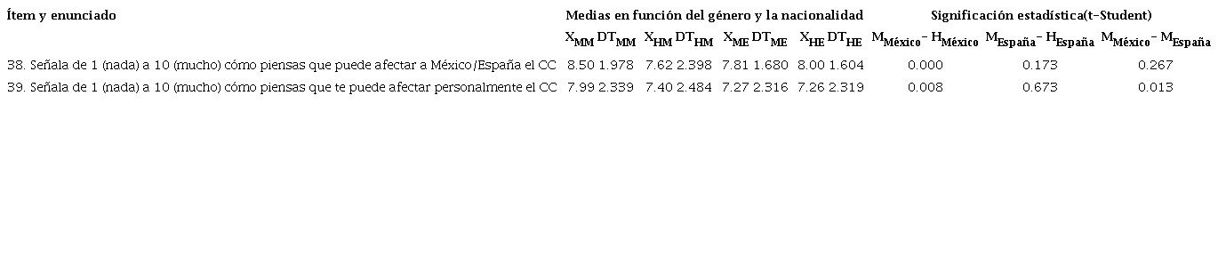En cuanto a las posibles diferencias, la prueba t-Student (Tabla 5) no reporta significación en la comparación por género salvo en un ítem en el caso mexicano y dos en el español. En el caso mexicano, los hombres respondieron acertadamente con mayor frecuencia al ítem que relaciona el CC con el aumento de enfermedades tropicales. Para el español, las mujeres respondieron correctamente con mayor frecuencia y significación al ítem que relaciona el aumento del nivel del mar con el proceso de dilatación del agua, mientras que los hombres mostraron un mayor conocimiento en el ítem que declaraba la globalidad de la afectación del CC. Sin embargo, al realizar los análisis de varianza de mujeres de Mexico y España, la prueba t-Student ofreció significación estadística en todos los ítems, en dos de ellos a favor del colectivo mexicano y en los otros seis a favor del español (Tabla 5).