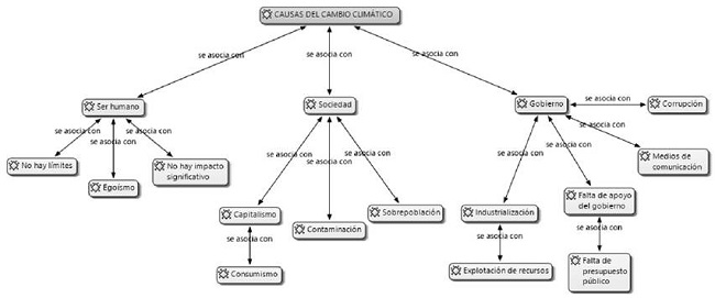 Respecto de la segunda pregunta, que indaga las causas del cambio climático, surgieron tres categorías. Los estudiantes y profesores señalan que las causas se asocian al ser humano, la sociedad y el gobierno. Respecto del ser humano mencionan que las causas se vinculan con el egoísmo, las acciones, el que no haya impacto significativo de acciones individuales; los estudiantes indican, además, la deforestación, la resistencia e incongruencia social. En relación con la sociedad los participantes mencionaron que el cambio climático se relaciona con el consumismo, el capitalismo, la sobrepoblación y la contaminación, que predominan en la sociedad actual; cabe mencionar que en este rubro los estudiantes incluyen a la falta de educación. Finalmente, respecto del gobierno los participantes señalaron que hay una falta de interés y de apoyo, señalan que existe corrupción, además de falta de presupuesto público y de sanciones para las industrias (Figuras 3 y 4).