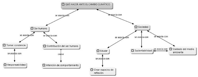 Respecto de la última pregunta, ¿qué hacer frente al cambio climático?, los participantes indicaron que lo importante es tomar conciencia de la contribución y de la responsabilidad de las acciones humanas sobre el cambio climático para avanzar hacia una intención del comportamiento. En relación con la sociedad, mencionaron educar y sensibilizar, crear espacios de reflexión, difundiendo información sobre sustentabilidad y cuidado del medio ambiente (Figuras 7 y 8).