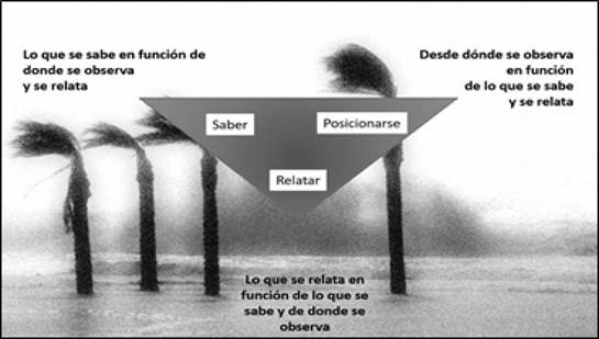 La noticia no solo se sustenta en lo que se relata, sino que también influye mucho la posición que adopta el periodista a la hora de construir su relato, puesto que lo que sabe/desconoce sobre una catástrofe puede estar distorsionado/reforzado por el punto de observación o encuadre. El enfoque de las noticias pues, no evalúa el contenido temático de la narración, sino el punto de vista desde dónde se coloca el periodista para relatar las catástrofes. Los encuadres son el resultado de “saber” + “posicionarse” + “relatar”. Así, el punto de observación está condicionado por el conocimiento del periodista a la hora de seleccionar, jerarquizar y organizar lo que quiere relatar, por lo tanto, “el periodista observa en función de lo que sabe y de lo que relata”, además “el periodista sabe en función de donde observa y de lo que relata” y, por último, “lo que se relata se hace en función de lo que el periodista sabe y desde donde observa” (Figura 1).