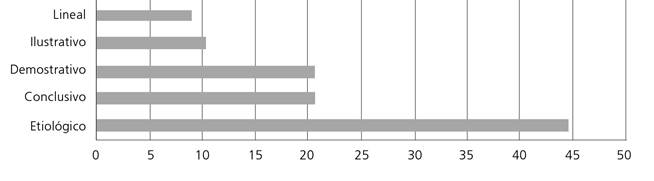 Tres de cuatro (77.6%) de los esquemas de afuera hacia adentro, es decir, demostrativos, más superficiales y genéricos, se posicionan desde las causas del impacto. En cambio, todos los ilustrativos (100%), narran lo acontecido de adentro hacia afuera y se imponen hegemónicamente en el discurso periodístico desde el centro mismo del impacto. Por último, dos de cada tres de los esquemas lineales (60%), es decir, más naturales, científicos, formales y canónicos, se posicionan desde la óptica de las consecuencias.