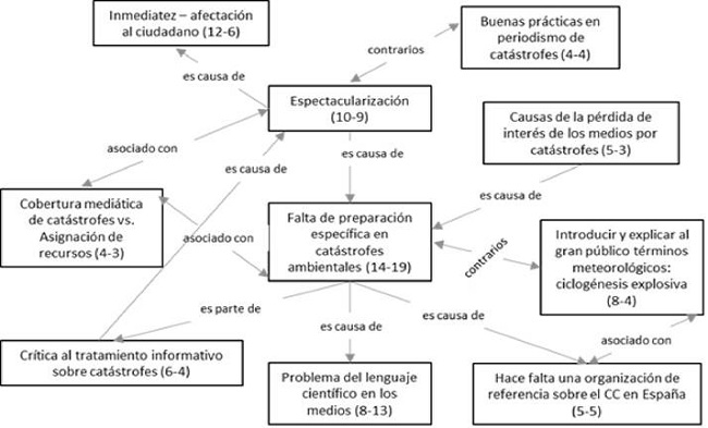 La profesionalización de la prevención de riesgos y catástrofes se entiende como el desarrollo sostenible de la divulgación científica, la responsabilidad de los medios de comunicación y la formación especializada de los periodistas. En la Figura 3 el lector puede constatar que los expertos consultados sostienen que la “espectacularización” y “la falta de interés de los medios” son las principales causas de la falta de preparación específica de los periodistas al informar sobre catástrofes medioambientales; relacionan esta ausencia de preparación con la falta de recursos y coinciden al afirmar que esa poca preparación de los periodistas favorece la incomprensión del lenguaje científico en los medios y que no exista una organización de referencia sobre temas relacionados con el acontecer de catástrofes, como, por ejemplo, el cambio climático.