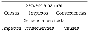 Para distinguir entre una catástrofe “real” y una “percibida” utilizamos la expresión “quiebras del acontecer” que permite trabajar con las representaciones que elaboran los sujetos o medios de comunicación. Hay que tener en cuenta que las catástrofes se manifiestan en la naturaleza o en el medioambiente con una lógica natural, es decir, determinadas causas provocan cierto tipo de catástrofes que, a su vez, incitan consecuencias puntuales. Ahora bien, esta lógica no es la que opera en la percepción social ni en la vigilancia del acontecer ya que, tanto en la mirada de los observadores como en los resúmenes informativos de los medios de comunicación, se impone otro esquema: primero se percibe la catástrofe en función de sus consecuencias directas y, por último, se identifican sus posibles causas. La Tabla 1 muestra la secuencia natural de los impactos y cómo es percibida por los sujetos concernidos por la catástrofe o quiebra del acontecer, de manera que el orden “natural” no coincide con el orden en que es percibido.