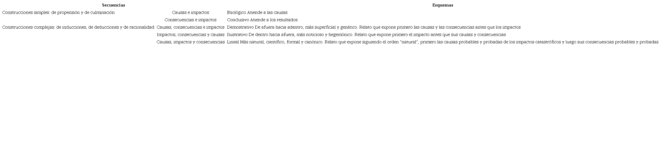 El 57.3% de los impactos que se sabe que van a ocurrir obligan a los mediadores a relatar la previsión con esquemas etiológicos. El resto de esquemas no se utilizan de manera significativa. El relato de la previsión mayoritariamente (68%) se realiza mediante esquemas simples, es decir, aquellos que solo vinculan dos momentos del proceso secuencial de las quiebras del acontecer, en tanto que, el resto (32%) de relatos de la previsión, se realizan mediante la utilización de esquemas complejos. Cuando se sabe que los impactos ya han ocurrido, casi la mitad (41.8%) utilizan el esquema etiológico y uno de cada cinco relatos (23%) utiliza el conclusivo. Podría suponerse que ante los hechos consumados los relatos tendrían que volcarse más hacia el esquema culminante y mejor aún hacia esquemas más elaborados y complejos, no obstante, dos de cada tres (64.8%) utiliza esquemas simples.