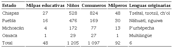 La Tabla 1 presenta la distribución de las 48 milpas en los cuatro estados, el número de niños, comuneros y milperos2 que participaron en el proyecto y sus respectivas lenguas originarias.