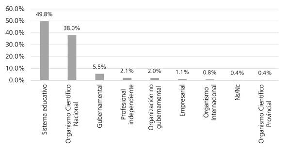 Como ya hemos destacado en un trabajo previo, consideramos pertinente reponer brevemente aquí, en vista del siguiente apartado, los principales destinos de los profesionales con doctorado en ciencias sociales: el sistema educativo (49.8%), y los Organismos Nacionales Científicos Tecnológicos (ONCT) (38%). En tercer lugar, aparece el empleo en el sector gubernamental, con un porcentaje reducido (5.5%). Los doctores que afirman ejercer como profesionales independientes apenas alcanzan 2.1% de los encuestados, en tanto un 2% declara trabajar en organizaciones no gubernamentales (ONG). La inserción en organismos científicos provinciales es minoritaria (0.4%).13 Completan el arco de ámbitos en los que se insertan los doctores aquellos que afirman dedicarse a la actividad empresarial (1.1%) y los que trabajan en organismos internacionales (0.8%) (Emiliozzi, 2021) (Figura 1).