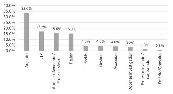 Quienes se encuentran insertos laboralmente en el sistema educativo, la abrumadora mayoría lo hace en el nivel universitario (95.5%), en tanto 6.8% lo hace en el terciario y 5.5% en el nivel secundario (lo que denota la sobrecalificación de quienes se desempeñan en este nivel).14 Entre quienes trabajan en el sector universitario las proporciones están más repartidas, no obstante, el grueso lo hace con el cargo de profesor adjunto (33.6%), seguidos de los jefes de trabajos prácticos (JTP) (17.2%) y los ayudantes (15.6%). Los titulares alcanzan 15.3% y los asociados 4%, en tanto quienes se dedican a la gestión representan 4.5%. (Emiliozzi, 2021) (Figura 2).