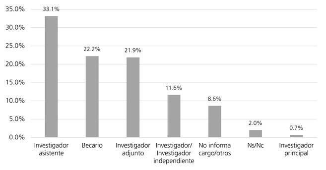 Los doctores que se insertan laboralmente en un ONCT (Figura 3) detentan diferentes categorías: un porcentaje mayoritario lo hace en la categoría investigador asistente (33.1%), seguido de investigador adjunto (21.9%) e investigador independiente (11.6%). Un grupo relevante de ellos (22.2%) se desempeñan como becarios posdoctorales (Emiliozzi, 2021).