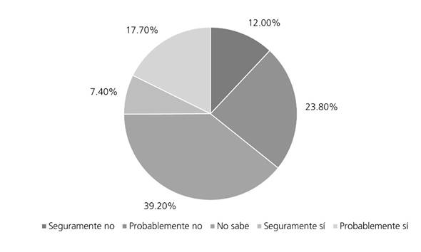 Entre los encuestados, frente a la pregunta si considera probable insertarse en el exterior, 39.2% de los doctores dicen no saber; 35.8% indica que segura o probablemente no, en tanto que 25.1% afirma que segura o probablemente sí lo hará (Figura 4).