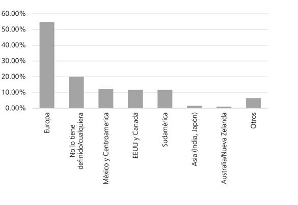 Notemos que el contexto de realización de la encuesta, en el año 2019, combina un escenario de recesión económica, con caída de salarios reales y una menor inversión pública en ciencia y tecnología a partir de las decisiones del gobierno nacional asumido a fines de 2015. Es claro que las referencias al contexto nacional y el malestar salarial de los doctores se vincula a ese proceso, del que, a pesar del cambio de gobierno en 2019, no se ha logrado salir hasta el presente. Entre quienes seleccionaron la opción de que probable o seguramente buscarán insertarse en el exterior, ante la pregunta sobre el destino que elegirían, la abrumadora mayoría selecciona algún país de Europa (54.6%), en tanto 12.2% escoge México o algún país de Centroamérica, 11.7% algún país de Sudamérica y también 11.7% Estados Unidos o Canadá como se ve en la Figura 5.15