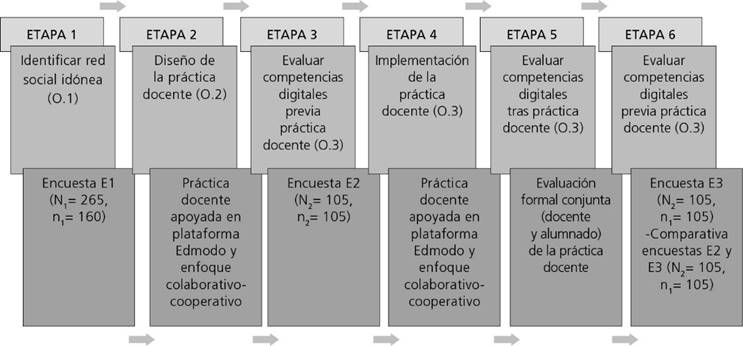 La investigación se ha desarrollado en seis etapas en función de los objetivos planteados. Tal y como se observa en la Figura 1, el trabajo se inició con el desarrollo de una encuesta sobre redes sociales en el ámbito de estudio (E1). En función de sus resultados se procedió a la elección de la red social como herramienta complementaria de aprendizaje y al diseño y configuración de la práctica docente. Una vez diseñada y antes de ser desarrollada, los estudiantes realizaron una segunda encuesta de valoración del conocimiento sobre competencias digitales (E2). En la etapa 4 los estudiantes desarrollaron la práctica docente para, a continuación, evaluarla (etapas 5 y 6) como medida de la adquisición de sus competencias digitales (evaluación formal y E3).