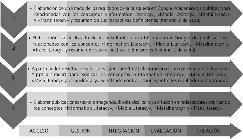 A partir de las competencias digitales seleccionadas, y bajo las premisas de un aprendizaje colaborativo-cooperativo (Martínez-Sala y Alemany-Martínez, 2017), se diseñó una práctica docente compuesta de cuatro ejercicios orientados a su adquisición (Figura 3). Para ello se estructuraron de forma que su resolución requiriera acceder a contenidos digitales (acceso); gestionarlos para verificar su validez, su pertinencia, etcétera (gestión); integrarlos mediante su interpretación, asimilación, resumen, etcétera, (integración); evaluarlos y utilizarlos con punto de partida para crear un contendido propio (evaluación y creación). Los ejercicios resultantes se desarrollaron en grupos de trabajo de tres estudiantes.