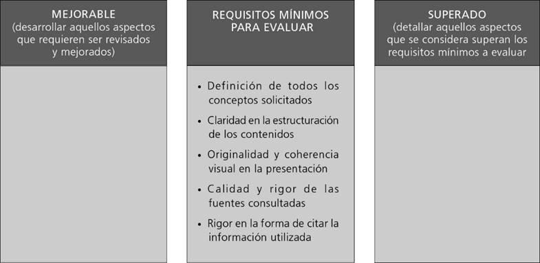 A partir de la encuesta E1 se escoge la red social idónea y se diseña la práctica docente que es evaluada de forma conjunta por docente y estudiantes, tal y como aconsejan Goicoetxea y Pascual (2002). De este modo se fomenta su implicación en su propio proceso de enseñanza (Tejada Fernández y Ruiz Bueno, 2016), así como un aprendizaje colaborativo (Martínez-Sala y Alemany-Martínez, 2017). Para ello, los estudiantes siguen un sistema de evaluación por pares a partir de las single point rubric (SPR) (Fluckiger, 2010) (Figura 4), facilitadas por la docente a través de la plataforma Edmodo, en el caso del grupo experimental, y del Campus Virtual, en el del grupo control. El sistema de rúbricas es habitual en los planteamientos docentes colaborativos (López-Gil y Molina, 2018).
